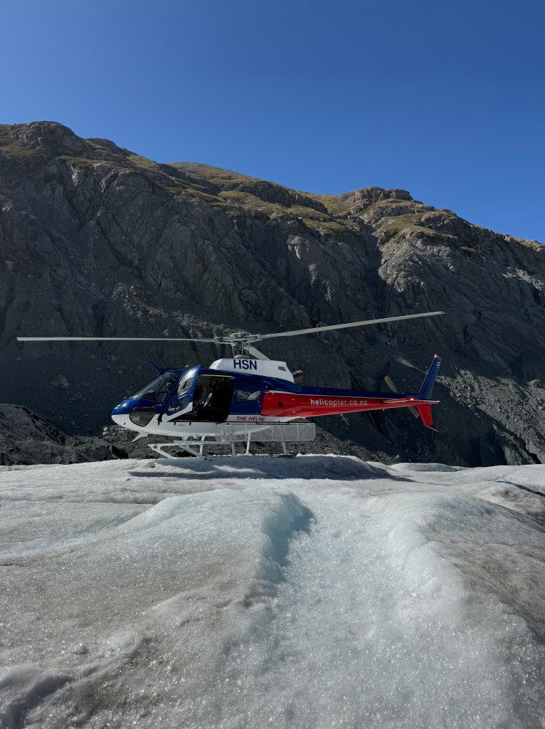 A helicopter had to take us to the top so we needed a ride to the airport in the morning. The hotel owners agreed to drive us the 7 minutes for a steep price of hundred New Zealand Dollars ($57 USD). After a weigh-in, a safety protocol, and a wait, it was finally time to head to the glacier (glassier).